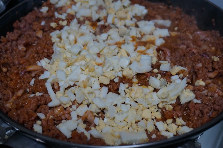 Picamos a trocitos pequeños los dos huevos duros y lo añadimos a la mezcla anterior, mezclamos y dejamos enfriar un poco.