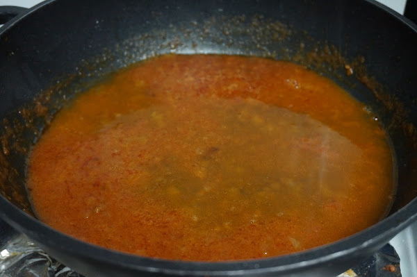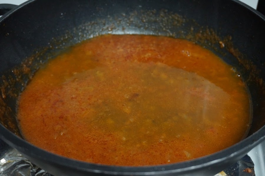 Utilizamos el aceite que queda, ponemos un poco más,picamos la cebolla, cuando tome un poco de color le ponemos el tomate triturado y dejamos 5 min. que se haga, pasado este tiempo ponemos el vino blando y dejamos que reduzca.