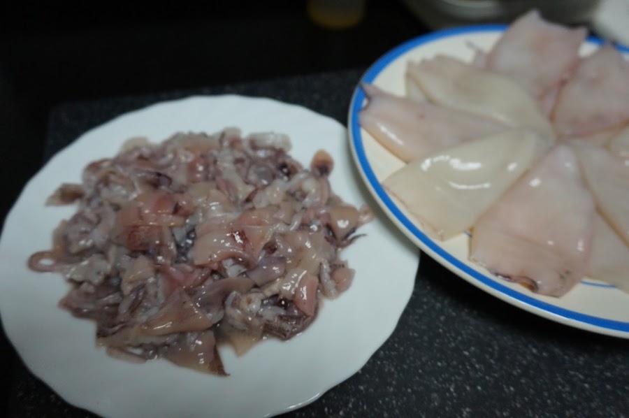 Empezaremos limpiando los calamares y separando los cuerpos de las patas y las aletas.