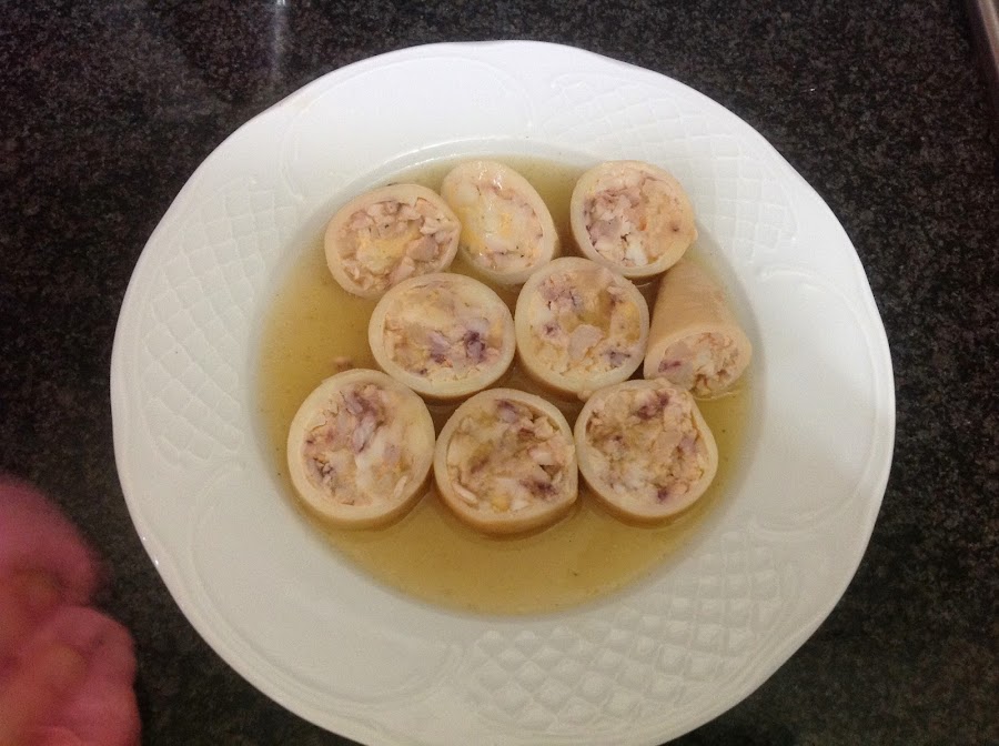 Sacamos los calamares y colamos la salsa para desechar la cebolla y los ajos que contenía la salsa y ya podremos servir. Como truco os diré que los calamares se cortan mejor fríos y no se deshace el relleno. Luego los presentamos a rodajas y napamos con la salsa.