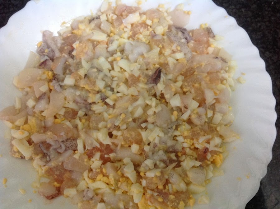 Pelamos las gambas y las añadimos al bol con el calamar picado y el huevo.