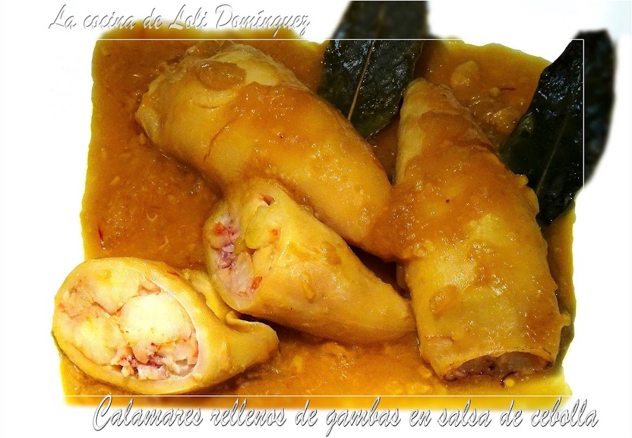 Calamares rellenos de gambas en salsa de cebolla, otra manera de preparar los calamares y con un resultado riquísimo, estupendos como plato para un día de fiesta y nuestros comensales quedaran encantados.