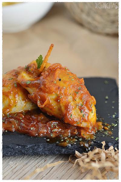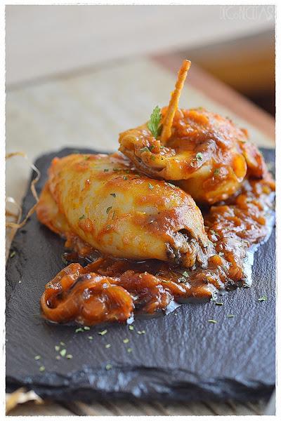 Rellenamos los calamares, cerramos con un palillo, pasamos por harina y los freímos ligeramente. Los depositamos en la salsa de cebolla y dejamos cocinar todo conjuntamente 5 minutos