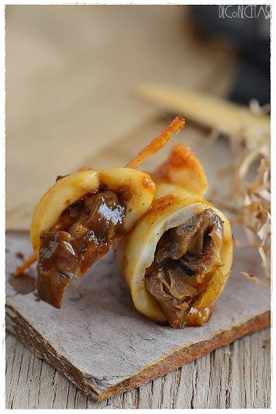 Primero preparamos el relleno de los calamares, pochando la cebolla y añadiendo los tentáculos cortados en trozos pequeños. Posteriormente, añadimos las setas y el arroz con el caldo de pescado, dejando cocinar 20 minutos