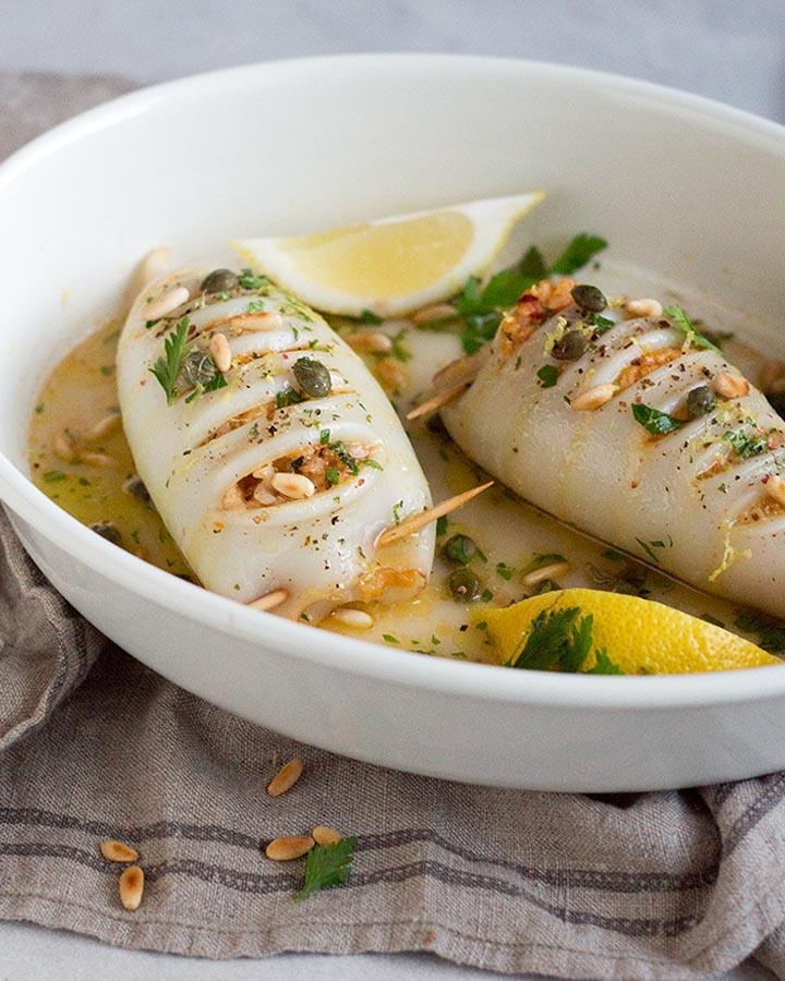 El relleno de arroz es muy sencillo de preparar e introducir en nuestros calamaras y luego, simplemente, al horno o a la plancha. Para completar el plato hago una salsa muy sencilla con vino blanco, zumo de limón, perejil y piñones.