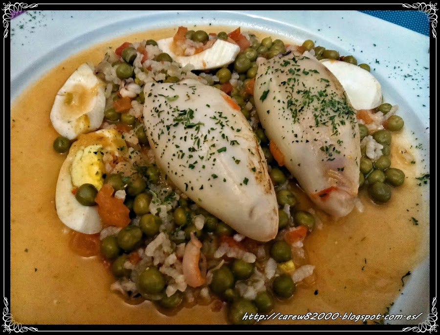 calamares , dejamos cocinar así durante 25 minutos para que los calamares se ablanden , pasado ese tiempo añadimos el sofrito restante , los guisantes y el arroz , rectificamos el punto de sal y dejamos cocinar de nuevo hasta que el arroz este bien cocido .
