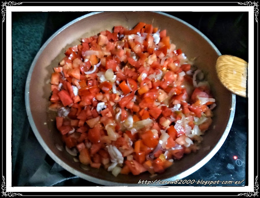 Cortamos las verduras en trocitos muy pequeños y los ponemos a pochar en una sartén con aceite de oliva a fuego lento , empezando con la cebolla , después los pimientos y por último el tomate con una pizca de sal y azúcar para quitarle la acidez , lo dejaremos pochar durante unos 30 minutos , pasado ese tiempo añadimos los trocitos de tentáculos y dejamos cocinar durante otros 10 minutos , también añadimos los trocitos de gambon y dejamos unos 5 minutos , retiramos el sofrito y dejamos enfriar.