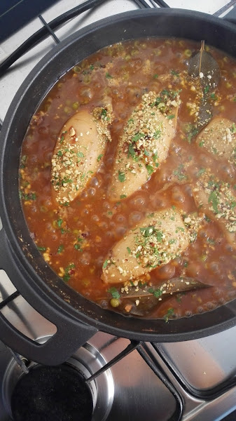 - El tamaño de los calamares deben ser de unos 20 cm. Es importante ya que cuando los guisamos pierden volumen y quedan casi casi la mitad.