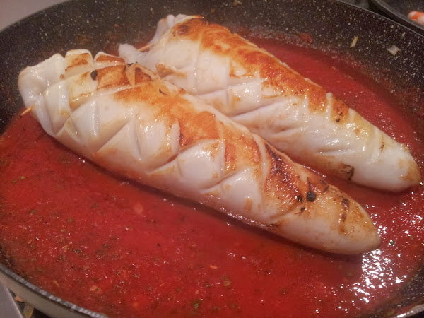 Momento de la salsa. En otra sartén incorporamos el bote de tomate triturado y espolvoreamos cebolla en polvo, orégano y perejil picado. Calentamos y colocamos encima los calamares. Dejamos que todo el conjunto se vaya cocinando a fuego moderado durante 10 minutos.