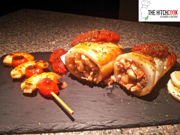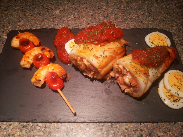 Y esto ya está listo. Sólo nos queda emplatar. Partimos por la mitad los calamares (para que así se pueda ver el relleno) y los disponemos en un plato. Echamos por encima unas cucharadas de la salsa de tomate, decoramos con el otro huevo cocido cortado en láminas y espolvoreamos perejil picado.
