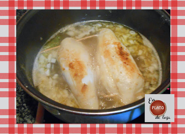 Es el momento de preparar la salsa. Se pueden probar varias. Yo suelo preparar una muy sencilla picando finamente una cebolla y un par de ajos y poniéndolos a sofreír. Cuando estén doraditos, añado el vino, los calamares, el laurel, la pimienta y sal. Dejo reducir el vino y añado un poco de agua y los dejo a fuego medio durante 40 minutos.