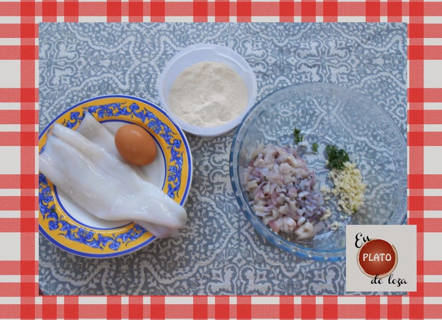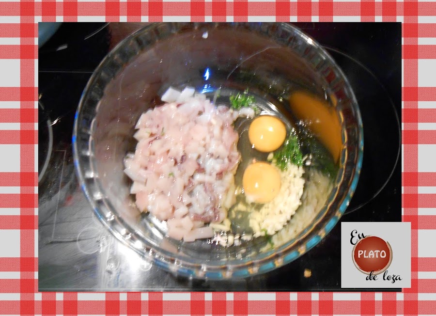 En un bol mezclamos bien los ingredientes para el relleno, es decir, los tentáculos picados del calamar, el huevo, el ajo, el perejil y un poco de sal. Le vamos añadiendo pan rallado hasta que tengamos una masa consistente pero no muy "sequerona".
