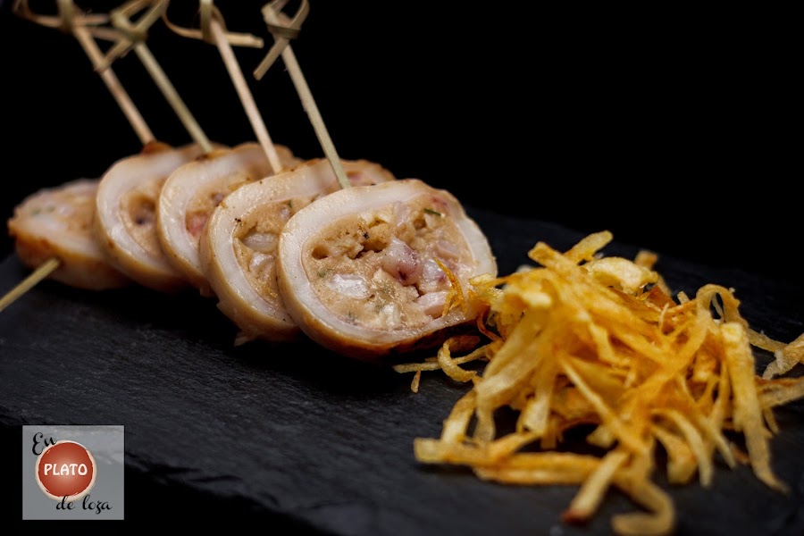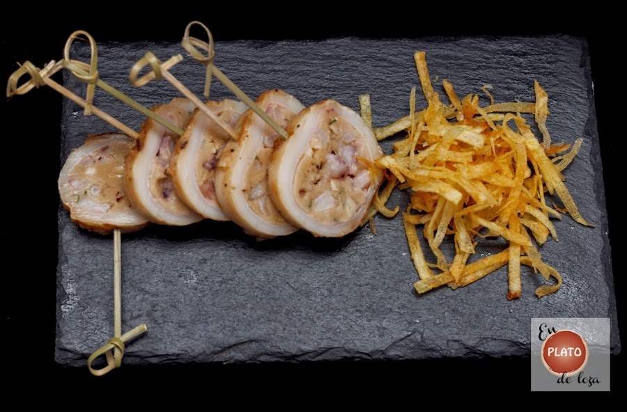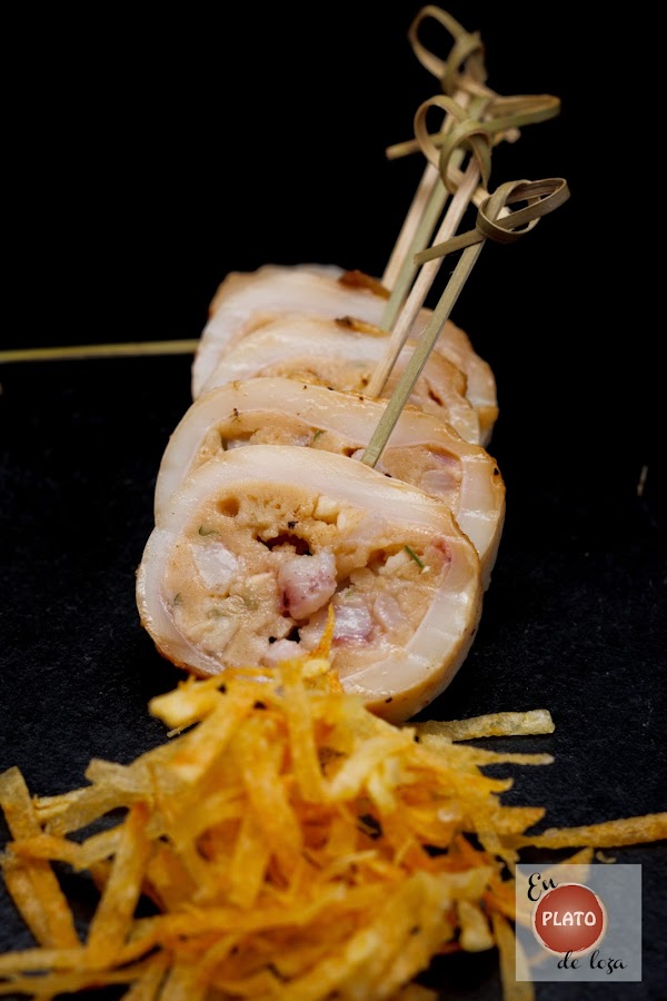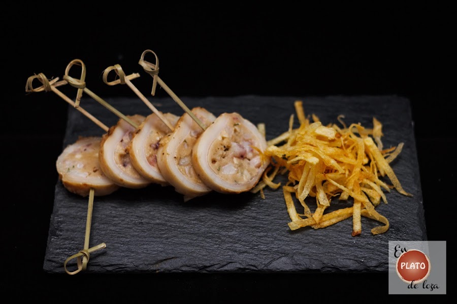 Una hoja de laurel.Lo primero que haremos es limpiar bien los calamares, separando los "rejos" del cuerpo. Los tentáculos y patas los picamos bastante pues formarán parte del relleno y al cuerpo le daremos la vuelta, es decir, el interior de la bolsa será nuestra parte exterior. De esta forma ayudamos a que aguanten más y que no se rajen en el momento de la cocción.