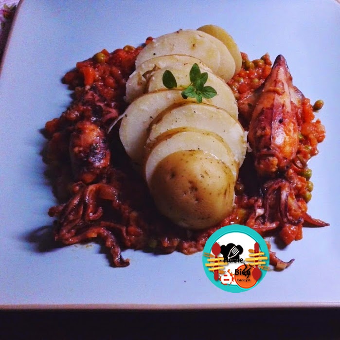 4.- Repartimos los calamares y platos y servimos con la patata cocida y cortada en rodajas.