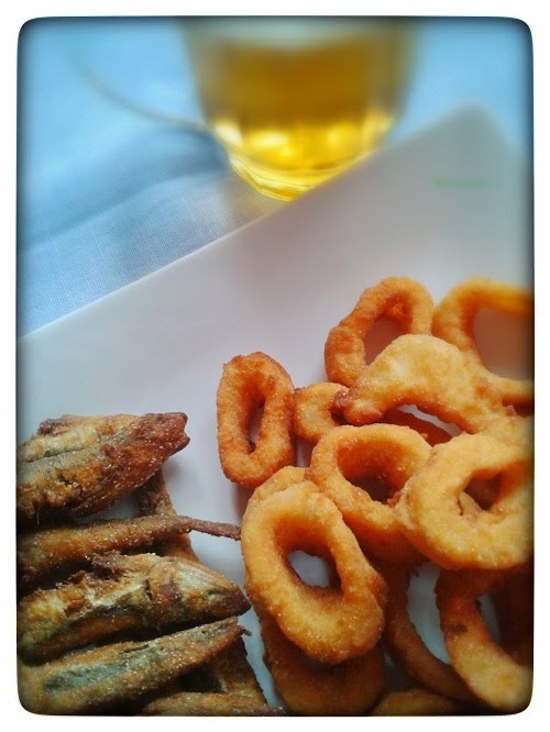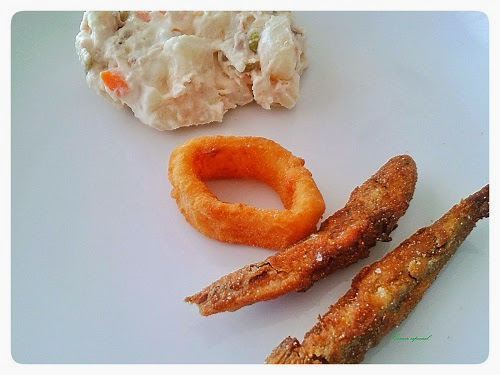 INGREDIENTES (para 4 personas): 1 plato hondo con frituras de pescado Santa Rita (mezcla de harinas de trigo y maíz preparada para fritura de pescado), 250 gramos de calamares, 250 gramos de gueldes, sal y aceite de oliva para freír.