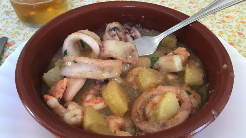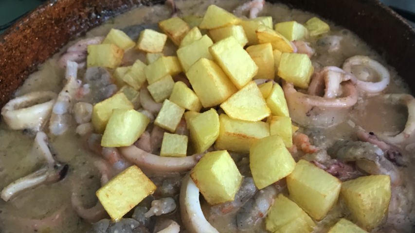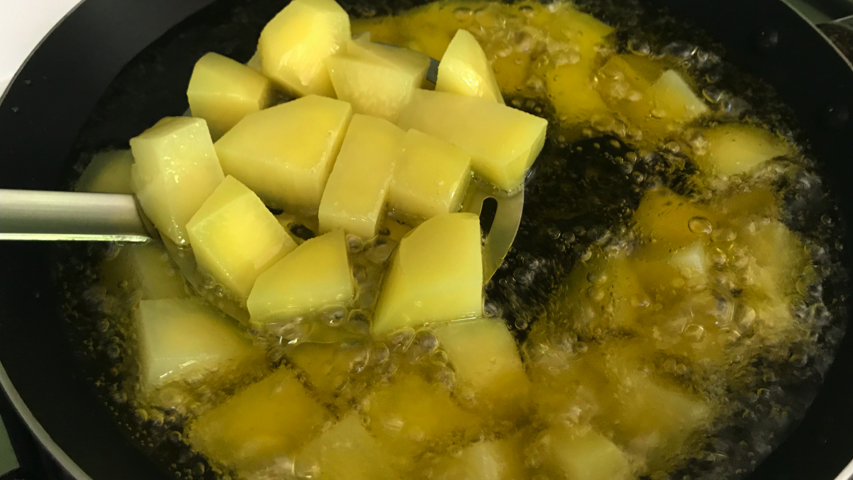 Mientras se hace el calamar pela unas patatas, enjuágalas, córtalas en cubitos y fríelas en aceite de oliva.