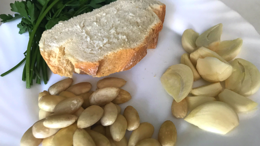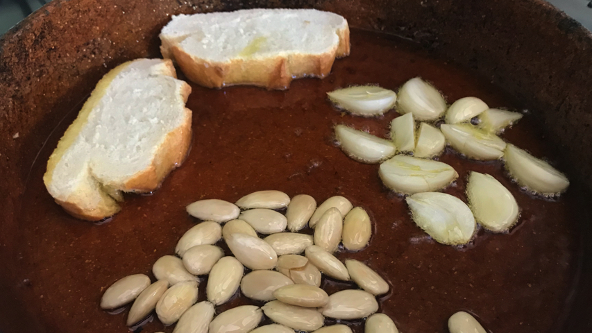 Pon la cazuela a fuego alto con un buen chorro de aceite de oliva y pon a sofreír el pan, los ajos y las almendras.