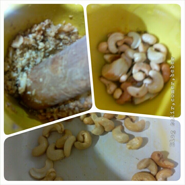 Mientras tanto, pelamos los ajos que teníamos reservados y machacamos en un mortero junto con un puñado de almendras o anacardos fritos, comino, pimentón, perejil y aceite.