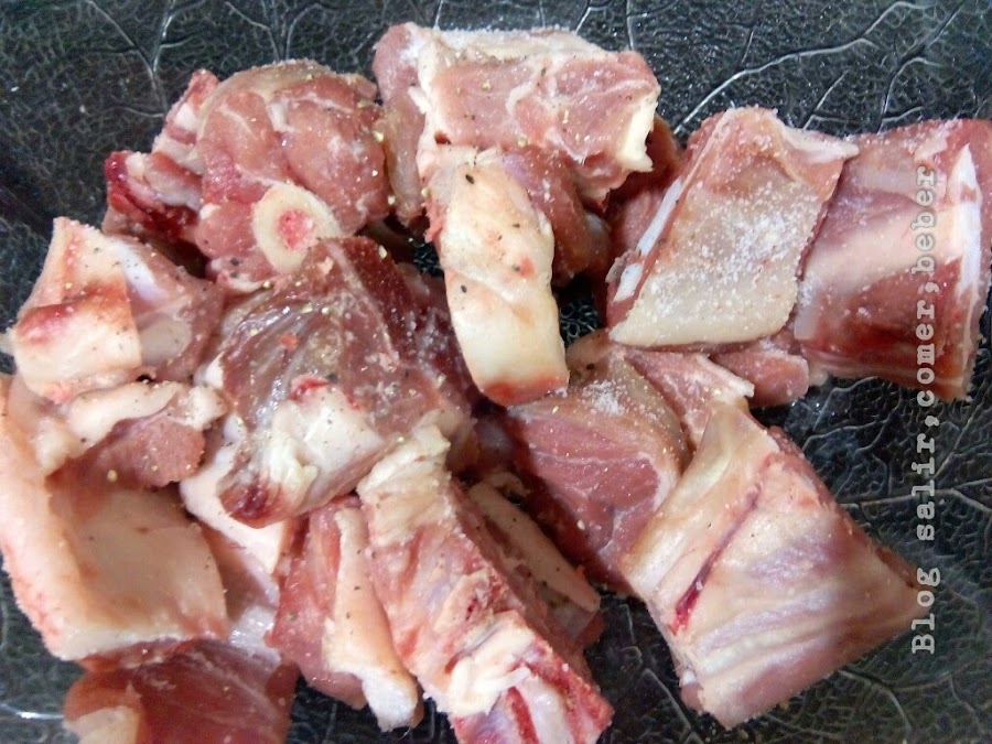 Ponemos la víspera a macerar el cordero en un bol con vino blanco, comino, tomillo, pimienta, sal y un poco de aceite de oliva.