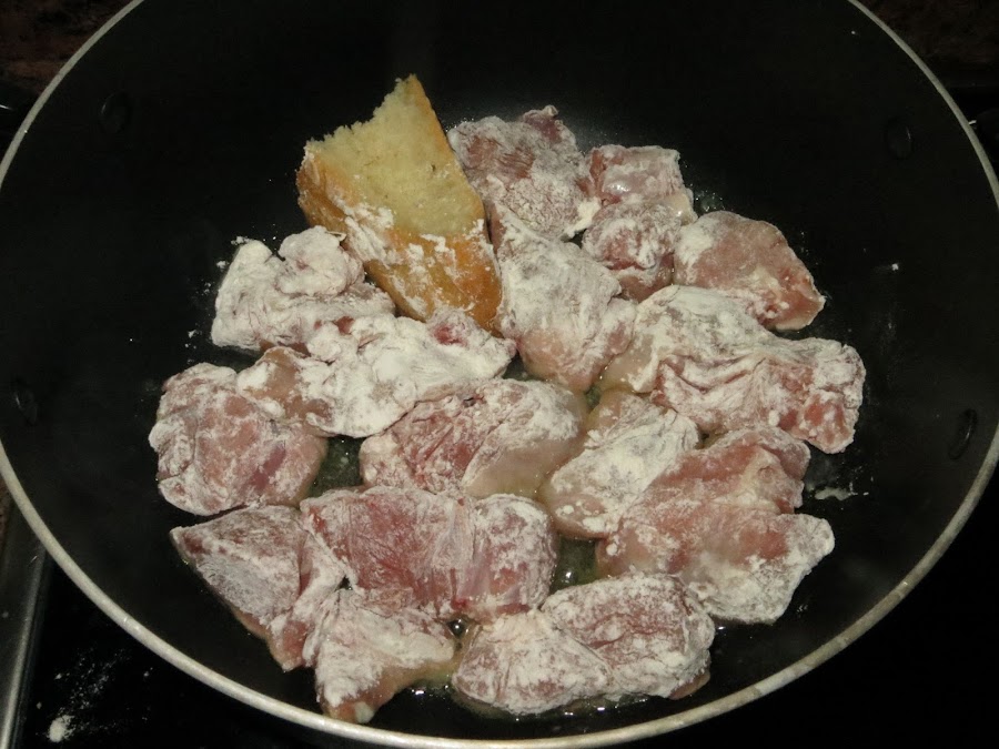 Echamos un par de cucharadas de aceite en la sartén y ponemos a dorar la carne, que antes habremos enharinado y salpimentado, con el trozo de pan. Una vez que ya está dorada, sacamos todo y reservamos.