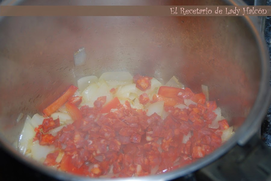 Trocea los chorizos y añádelos a la olla cuando el pimiento comience a estar blando. Remueve para que se mezclen los ingredientes.