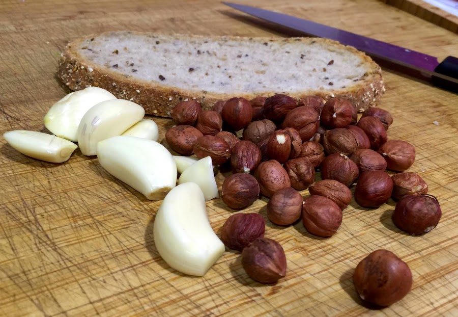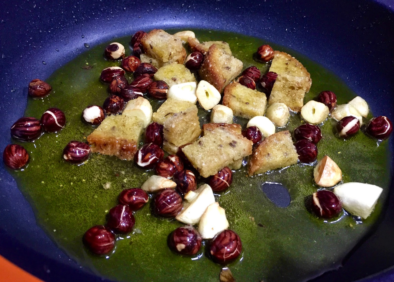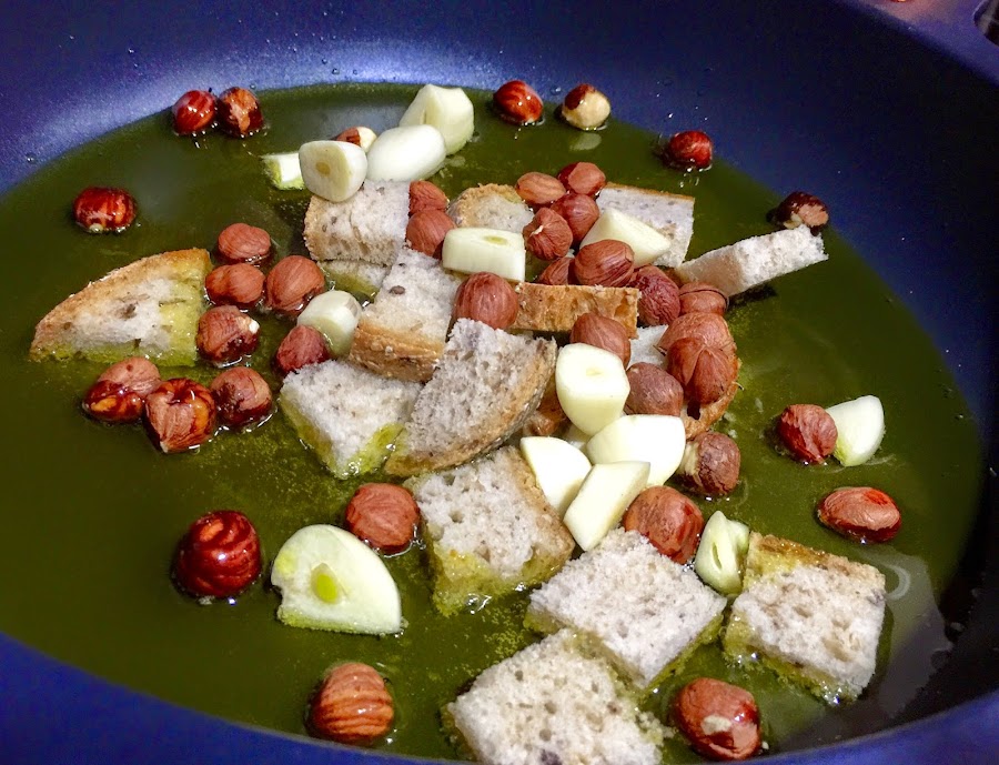 7. Mientras va cociendo el caldo podemos empezar a hacer la picada. Ponemos en la cazuela un chorro generoso de aceite de oliva virgen extra, calentamos a fuego medio. Añadimos los trozos de pan, las avellanas crudas y los dientes de ajo cortados por la mitad.