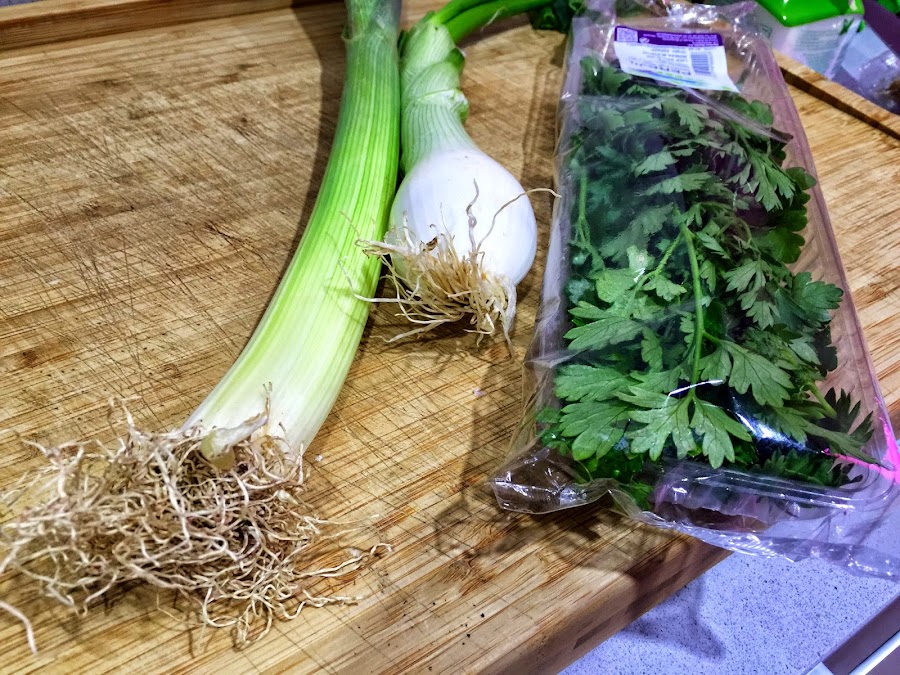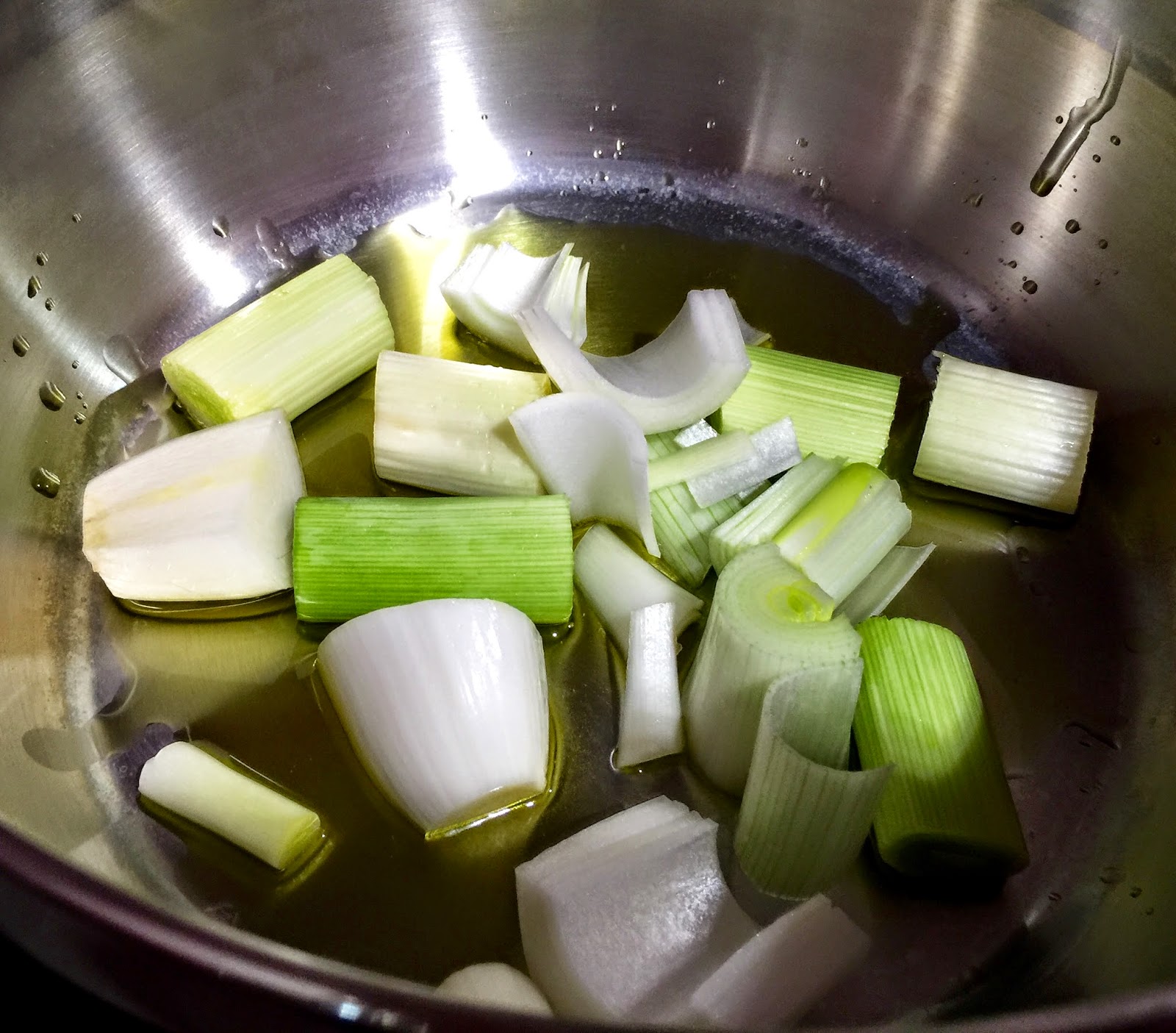 3. Empezamos a preparar el caldo de pescado. En una olla grande ponemos un poco de aceite de oliva virgen extra. Cortamos la cebolla y el puerro en trozos grandes y los añadimos, los rehogamos durante 2-3 minutos a fuego alto. Añadimos un ramillete de perejil fresco y seguimos rehogando durante 2-3 minutos mas.