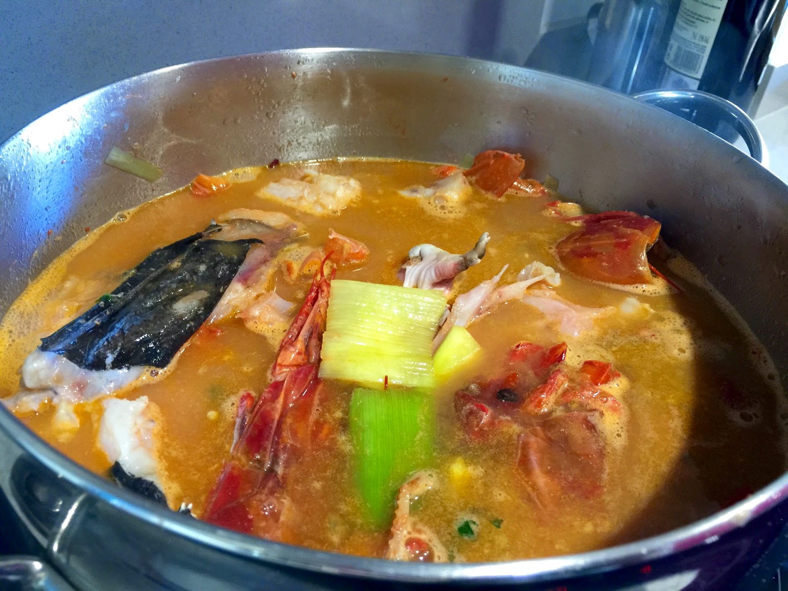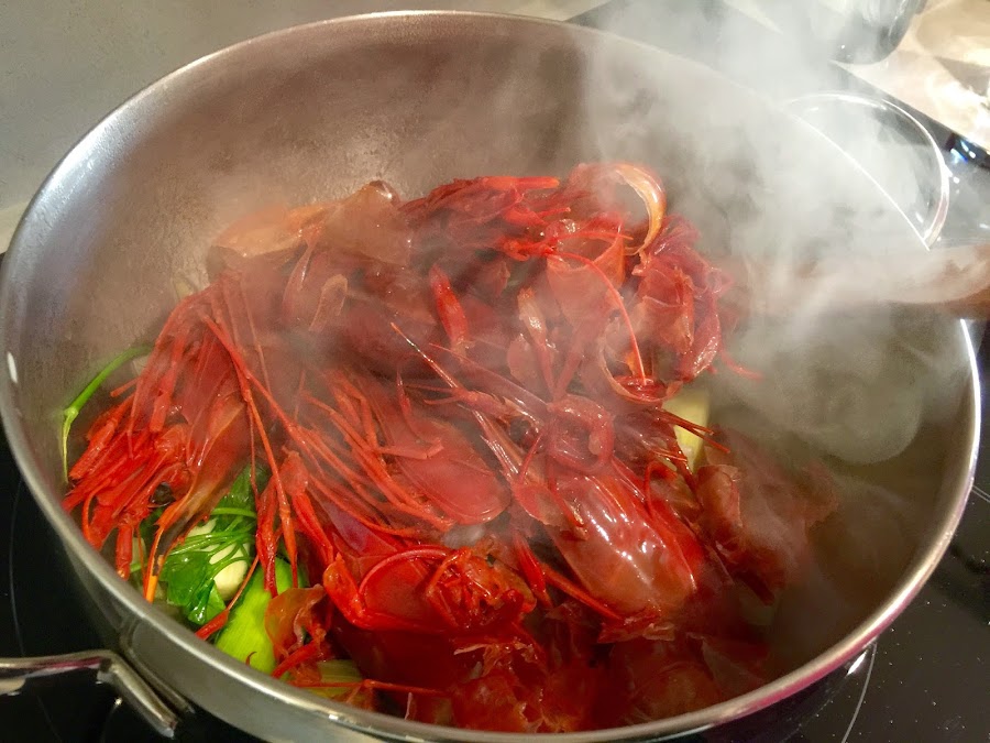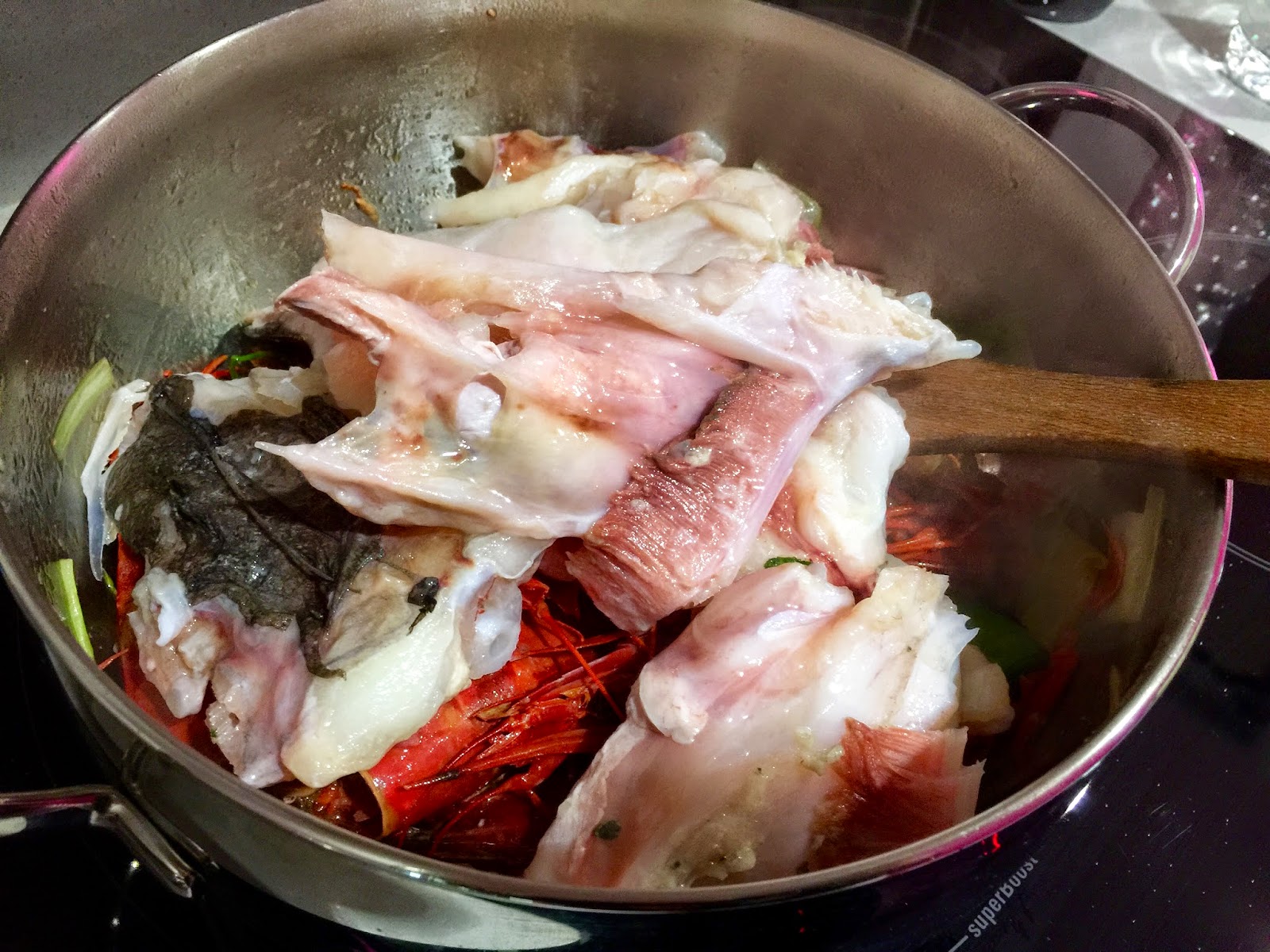 4. Añadimos las cabezas y las cáscaras del carabinero a la olla. Seguimos rehogando y añadimos los trozos de la cabeza del rape. Podéis pedir en la pescadería que os corten la cabeza del rape en trozos mas pequeños. Yo los corté en casa.
