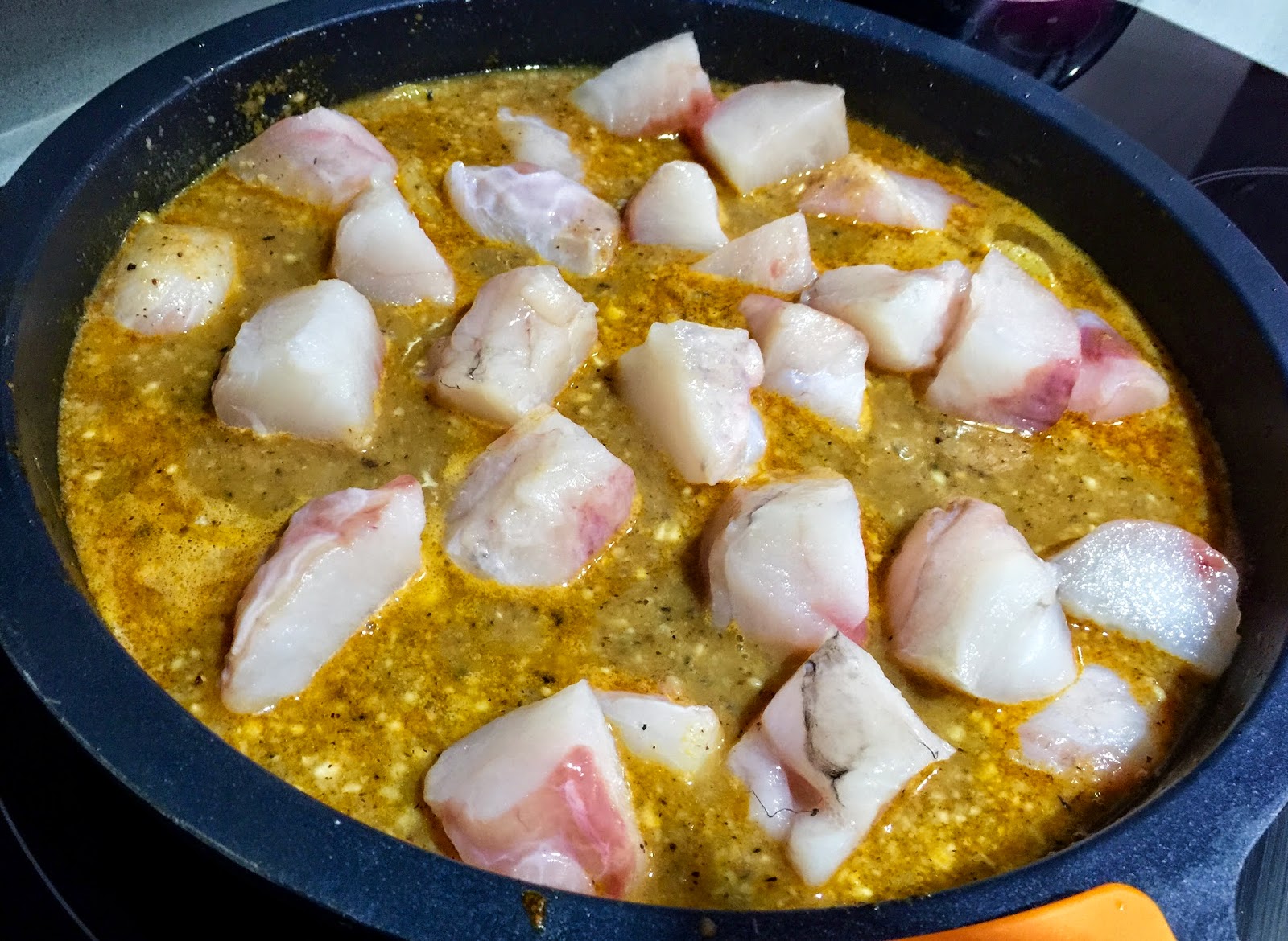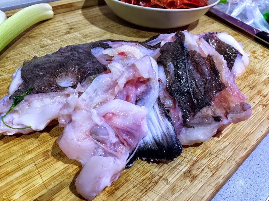 2. Preparamos el rape. En la pescadería ya pedí que me separaran la cabeza y que me preparasen la cola. Para esta receta nos interesa que nos separe la carne de la espina en dos lomos. Dividimos cada lomo en dos, en total tenemos 4 lomos. Cortamos cada lomo en tacos, medianos.
