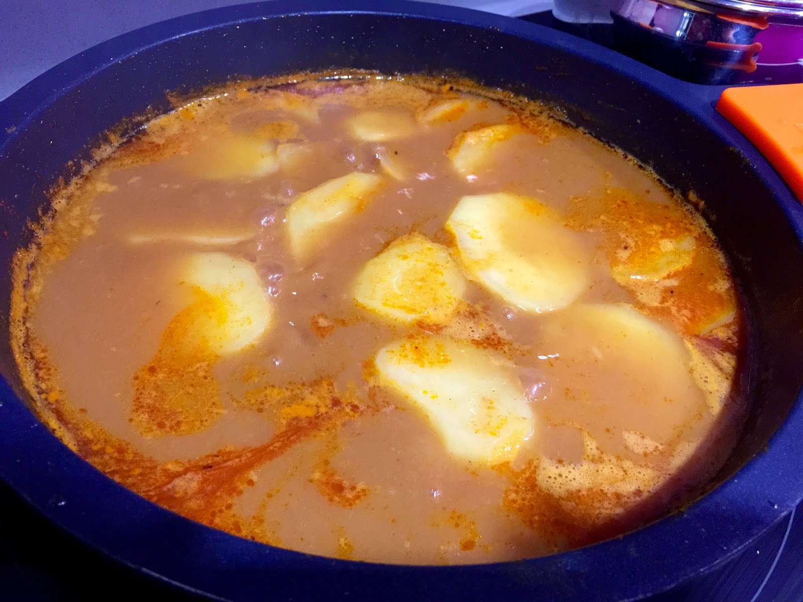 13. Añadimos las patatas a rodajas y las mezclamos bien con el aceite y el pimentón. Cubrimos con todo el caldo de pescado y dejamos a fuego medio-bajo durante 20 minutos.