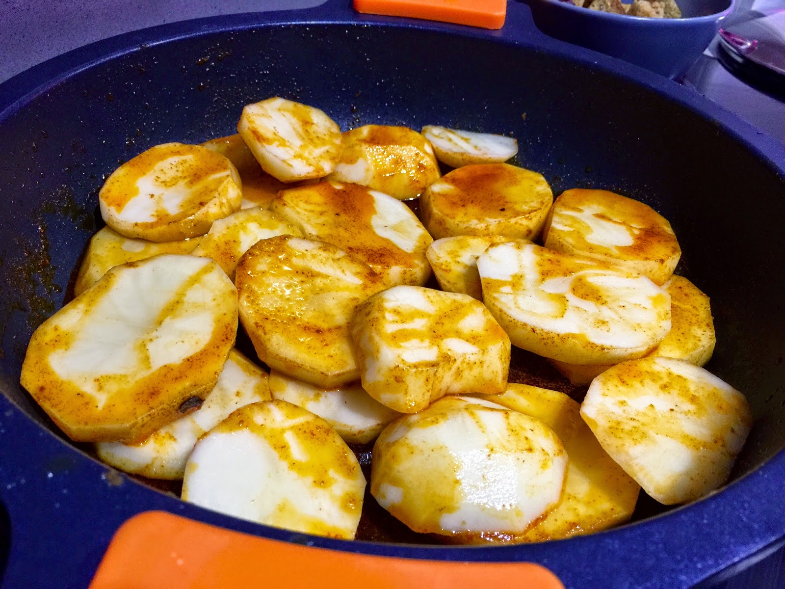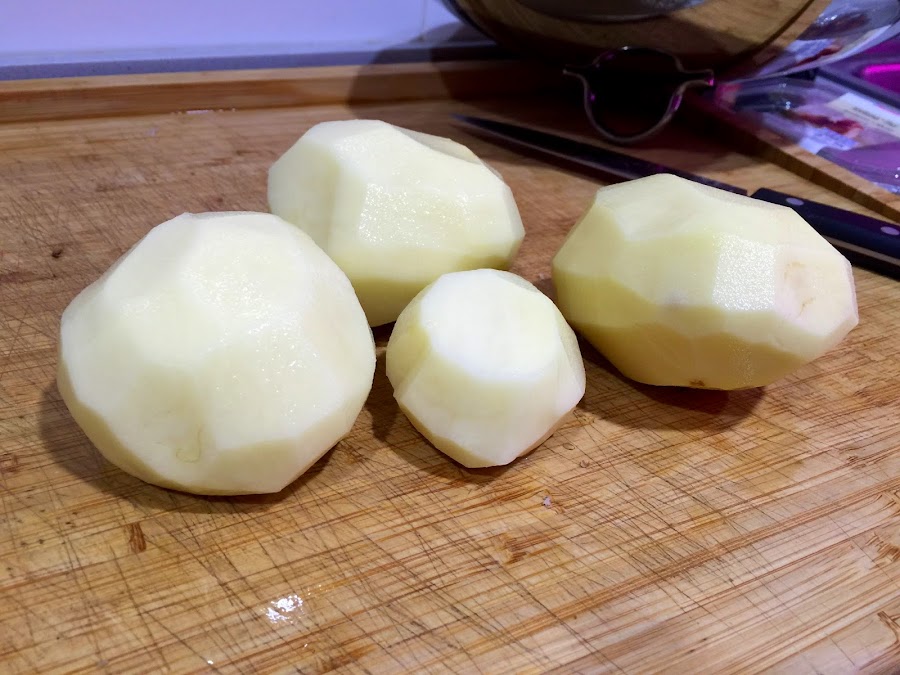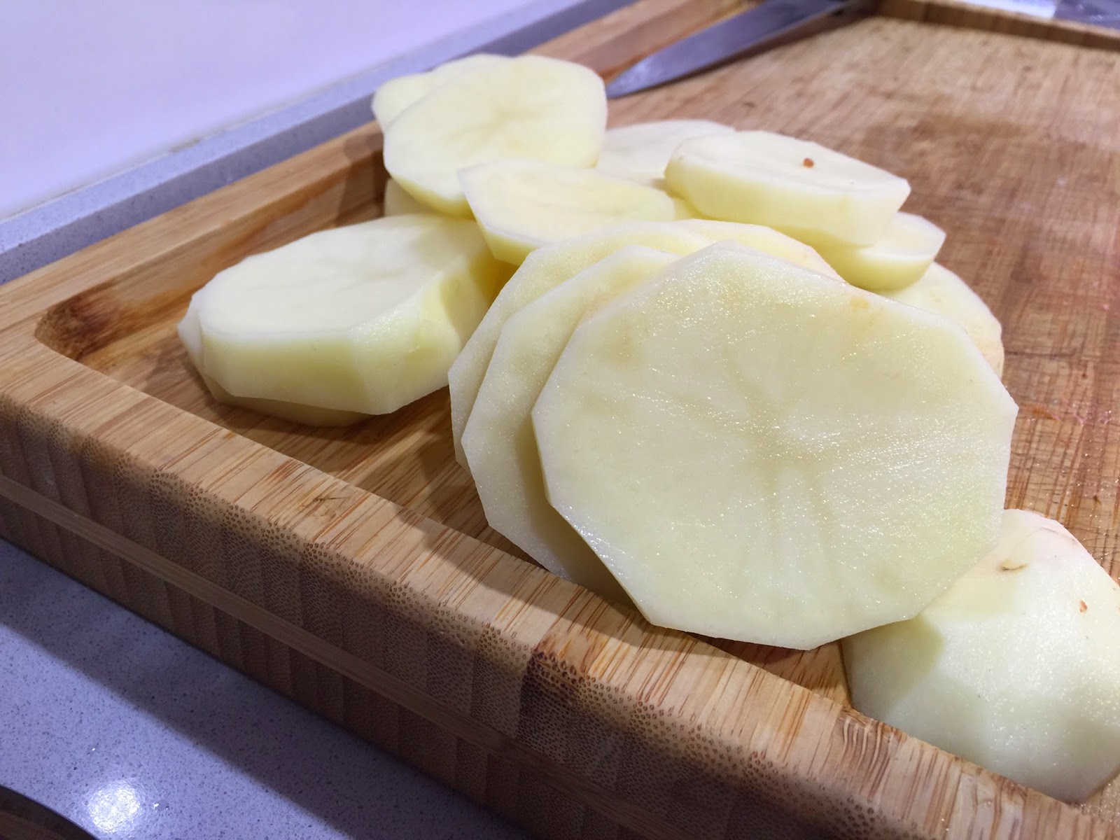 11. Pelamos, lavamos y cortamos en rodajas de 1 cm las patatas.