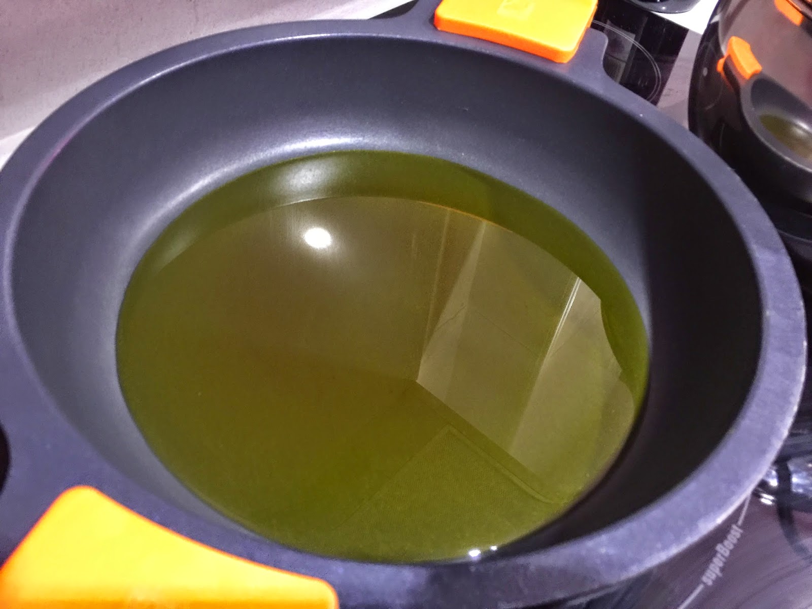 8. Freímos hasta que tome un color tostadito. Con una espumadera retiramos la picada al mortero, en la cazuela dejamos el aceite para luego.