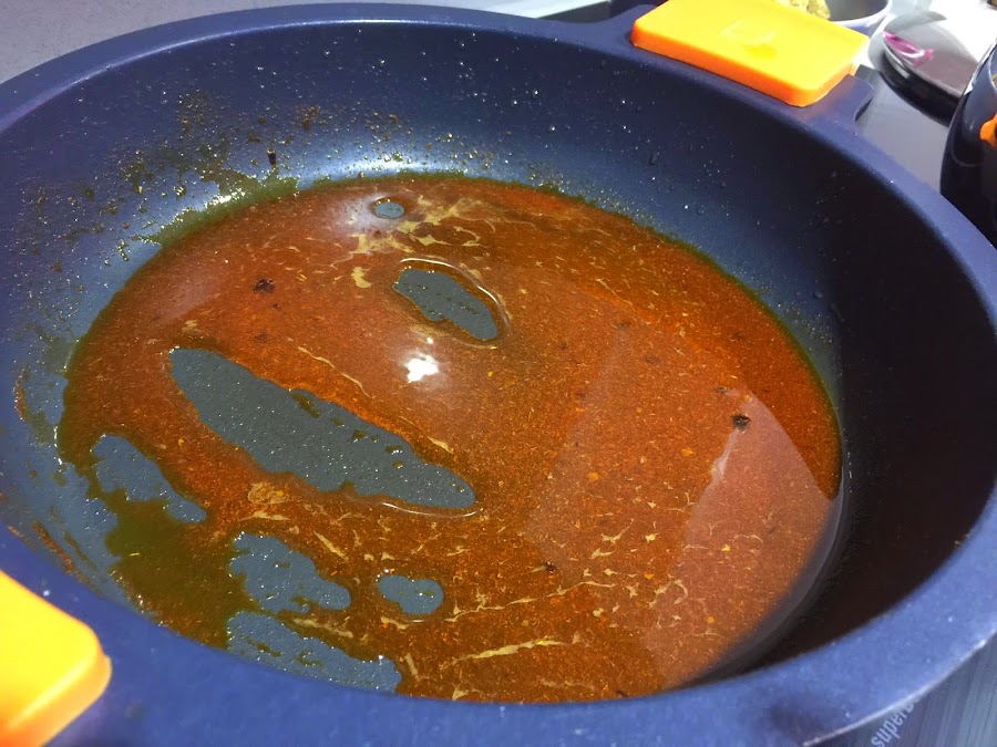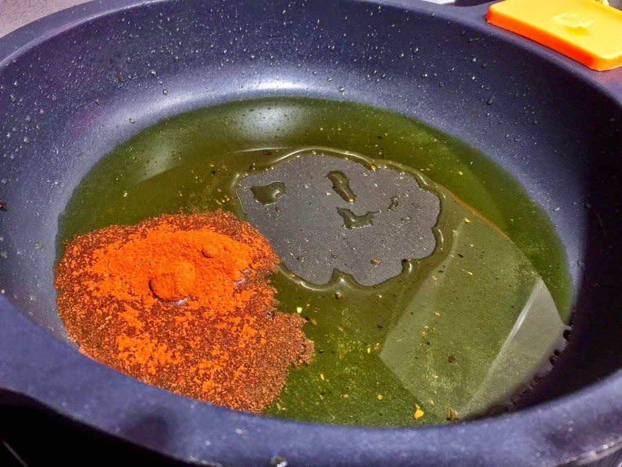 12. En el aceite donde hemos frito la picada añadimos una cuharadita de pimentón de la vega picante. A fuego muy bajo sofreímos durante 1 minuto.