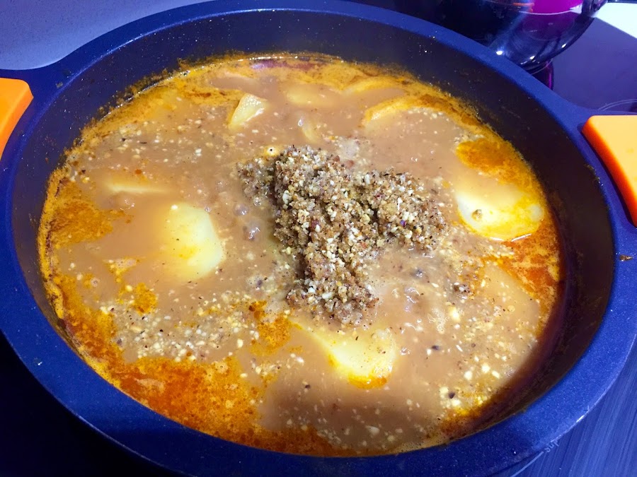 14. Pasados los 20 minutos añadimos la picada, con esta conseguiremos que la salsa tome mas consistencia.