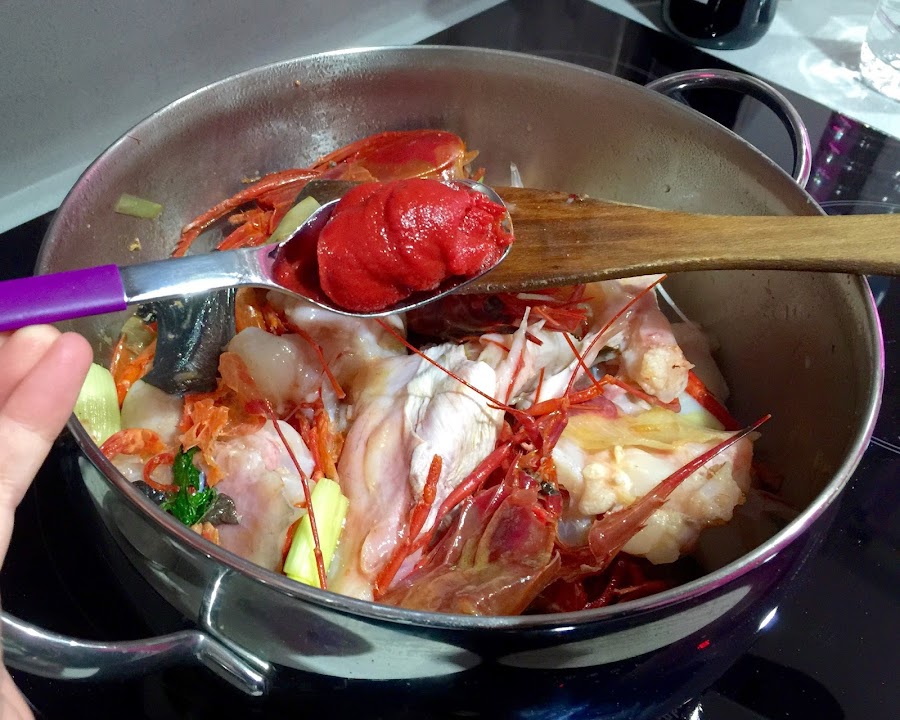 5. Añadimos 2 cucharadas de pasta de tomate concentrado, esto le aportará color y sabor al caldo. Sofreímos todo durante 5-6 minutos a fuego medio-alto. Presionar las bien las cabezas del carabinero para que suelten toda la sesada y desprendan al máximo todo su sabor.