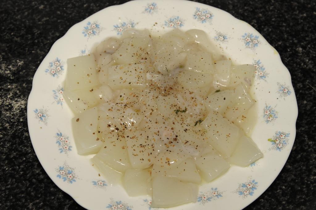 Limpiamos y troceamos en trozos de bocado, la sepia, salpimentamos y reservamos.