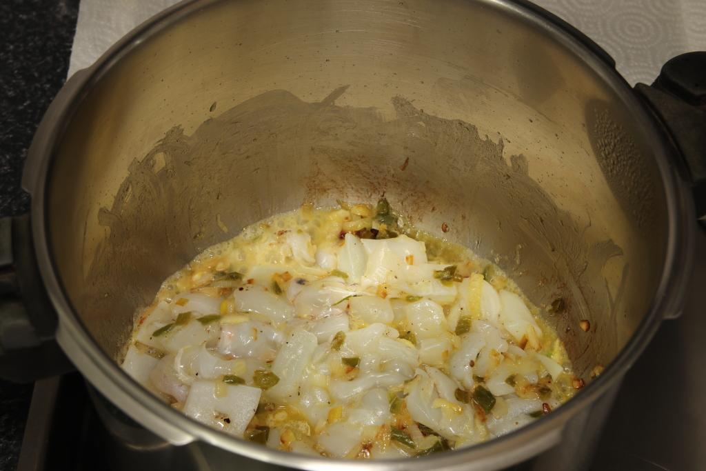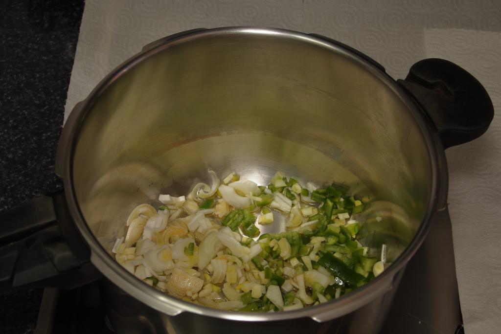Limpiamos y picamos menudos el ajo, el pimiento verde, la cebolla y pochamos en una olla rápida con un chorro de aceite de oliva.
