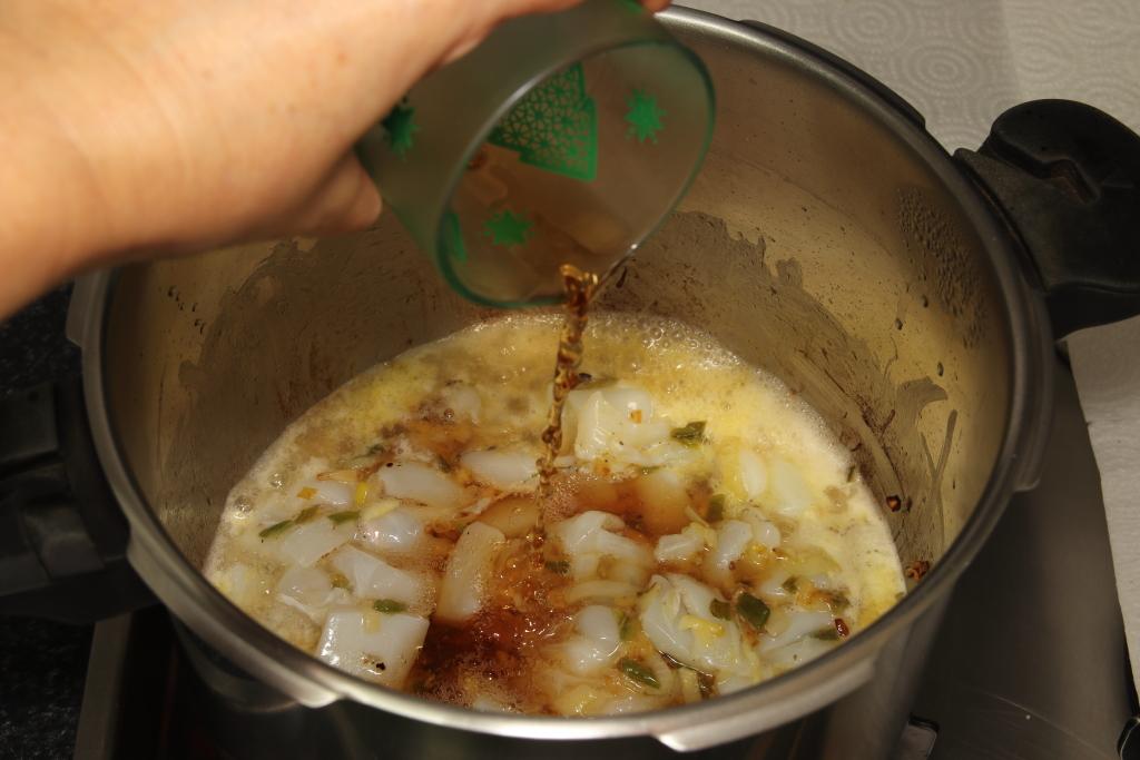 Una vez pochado todo añadimos la sepia y subimos a fuego fuerte. Removemos, dejamos un par de minutos y vertemos el vino blanco y el branby. Cocinamos hasta que se evapore el alcohol.