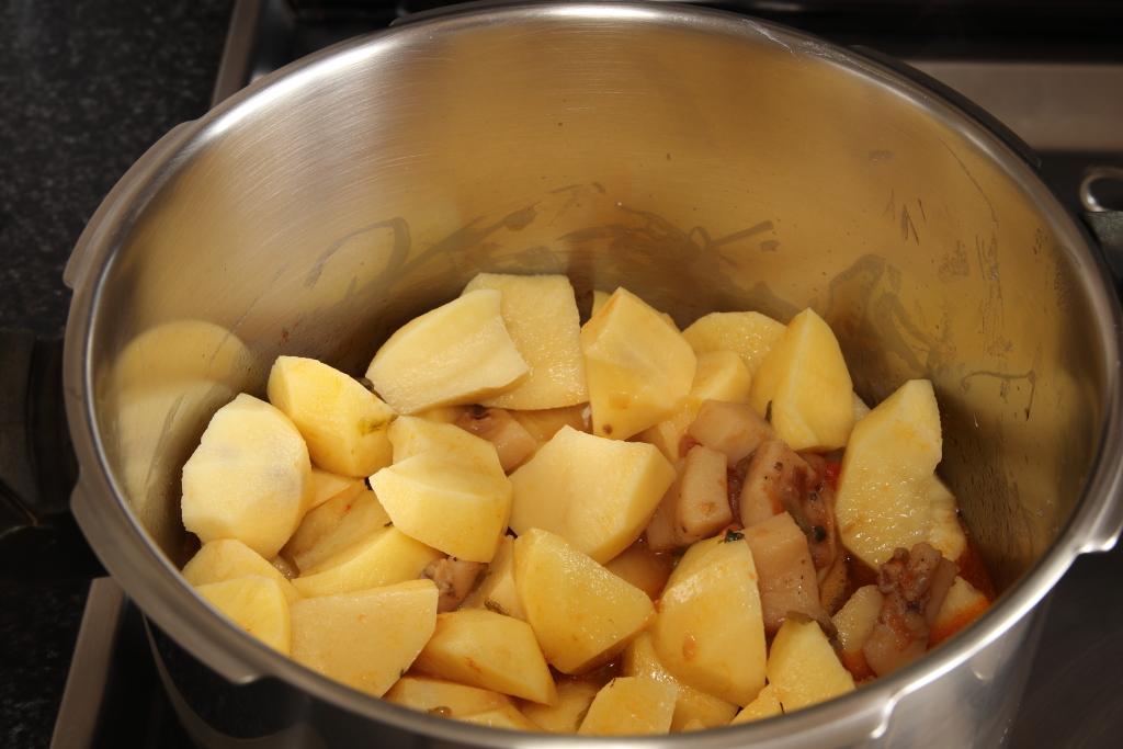 Incorporamos las patatas, mezclamos bien, añadimos el tomate rallado, el perejil picadito y el caldo que no es necesario que cubra el guiso pero casi, removemos, rectificamos de sal y cerramos la olla. Desde que comienza el vapor dejamos cocer 9-10 minutos.