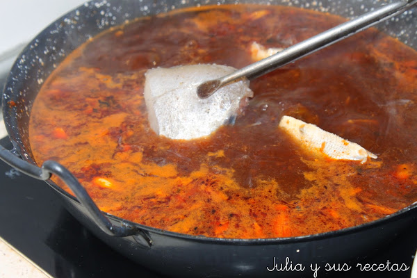 Añadimos el pescado cortado en rodajas junto con sal, pimienta y azafrán. Lo dejamos cocer unos 5 minutos.