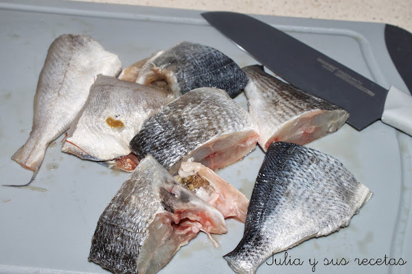 Primero limpiamos el pescado y les quitamos las cabezas. Las reservamos. Partimos el pescado en trozos.