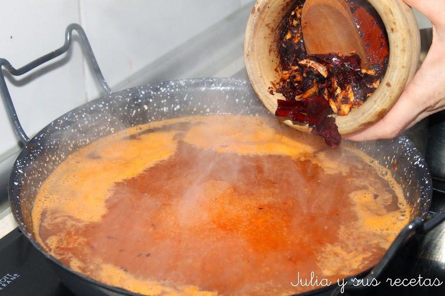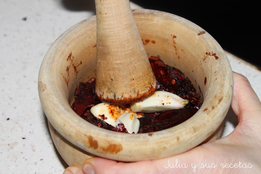 En el mortero machacamos las ñoras y 6 dientes de ajo.