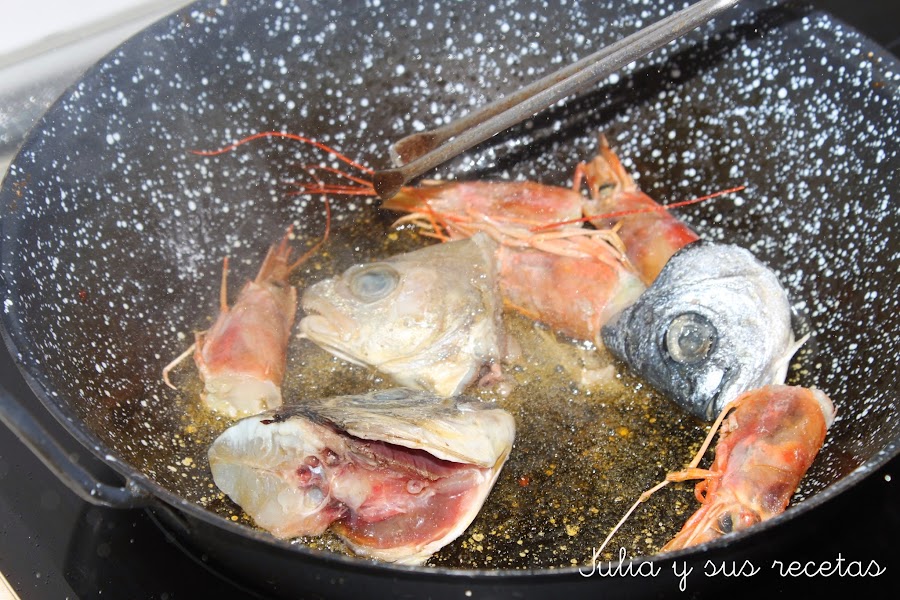 Echamos las cabezas del pescado, las freímos y las sacamos.
