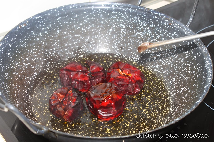 Ponemos al fuego un caldero con la mitad del aceite y cuando esté caliente freímos las ñoras, cuando estén fritas las sacamos y apartamos.