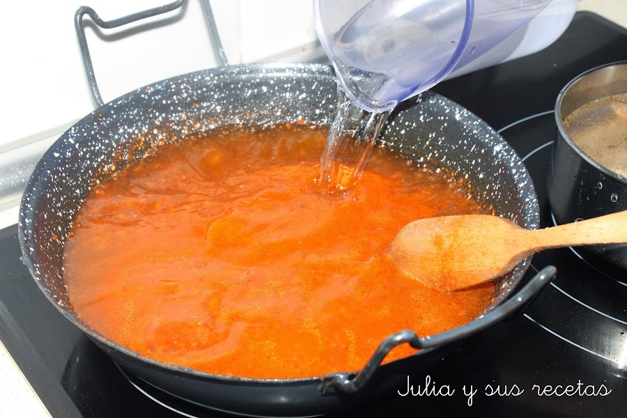 Cuando esté sofrito añadimos 2 litros de agua.