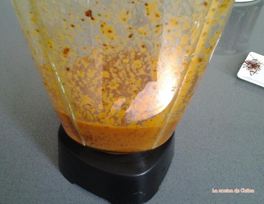 En la batidora ponemos las ñoras, los dientes de ajo, las hebras de azafrán, los cominos, el perejil y un vaso de agua.