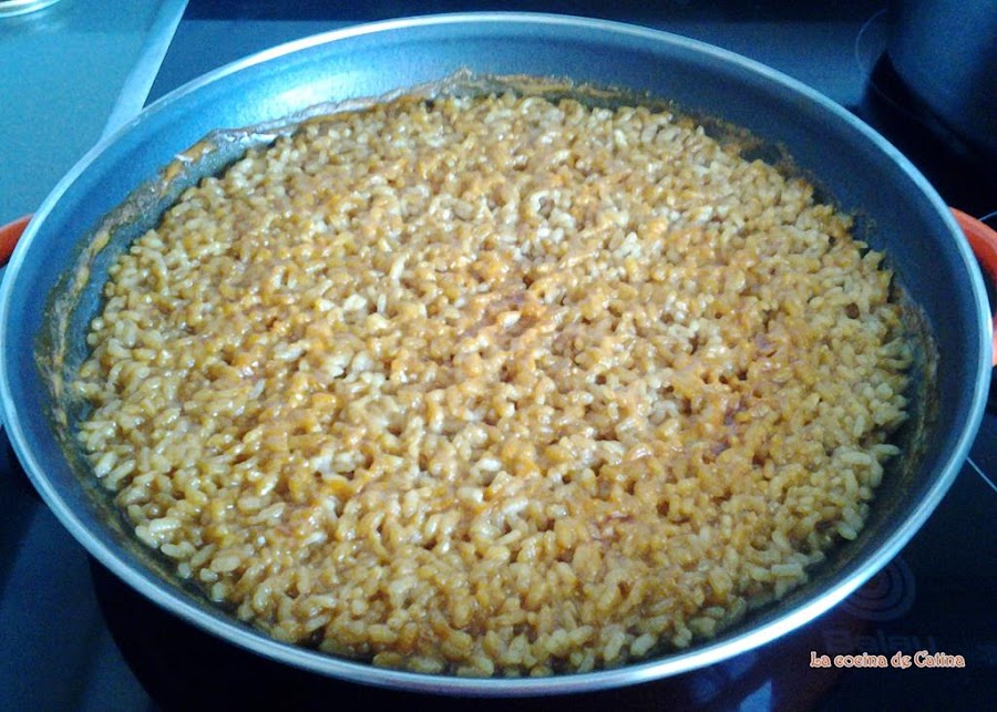 Ponemos el arroz en una paellera, añadimos el caldo y lo dejamos cocer. Debe quedar un arroz meloso para lo cual si es necesario le añadimos más caldo.