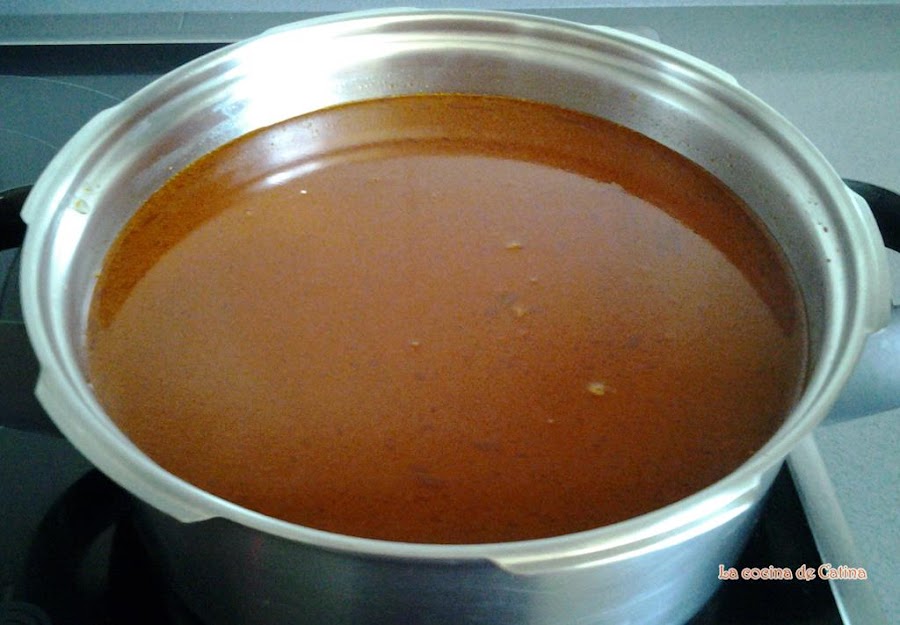 Trituramos todo bien y lo añadimos a la olla donde tenemos el sofrito, ponemos el pescado, echamos el resto de agua y ponemos a cocer de 20 a 25 minutos, probamos de sal y dejamos reposar un rato.