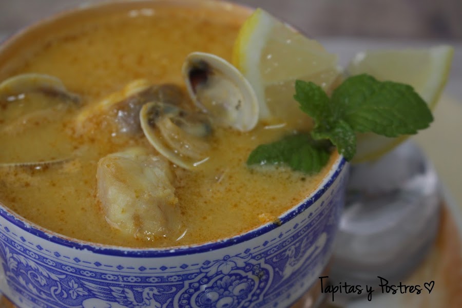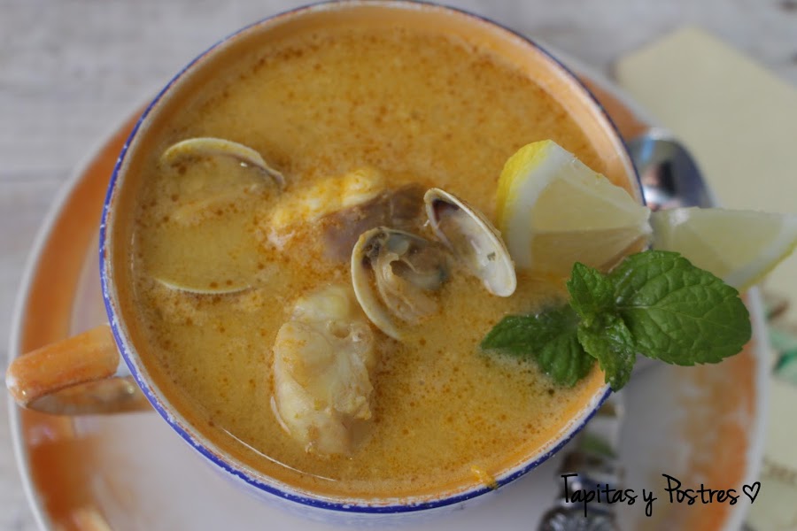 Es un caldo marinero, que se prepara con pintarroja, un pescado de la familia de los tiburones, con una piel dura y rasposa, tan dura que los pescaderos la venden ya sin piel.