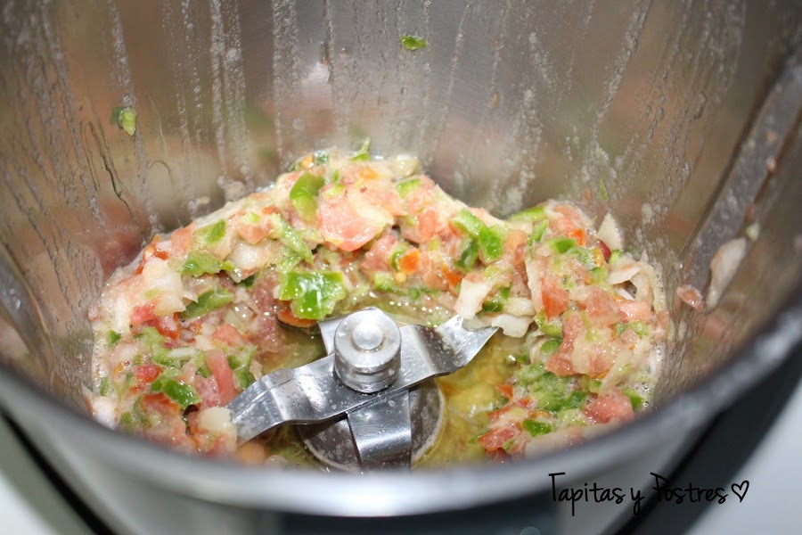 Lavamos el vaso y la tapa y ponemos la cebolla, el pimiento y los tomates a cuartos y trituramos 5 segundos a velocidad 4. Añadimos el aceite y sofreímos 8 minutos a temperatura Varoma y velocidad 1. Dejamos que se baje la temperatura un poco y trituramos 15 segundos a velocidad 7.